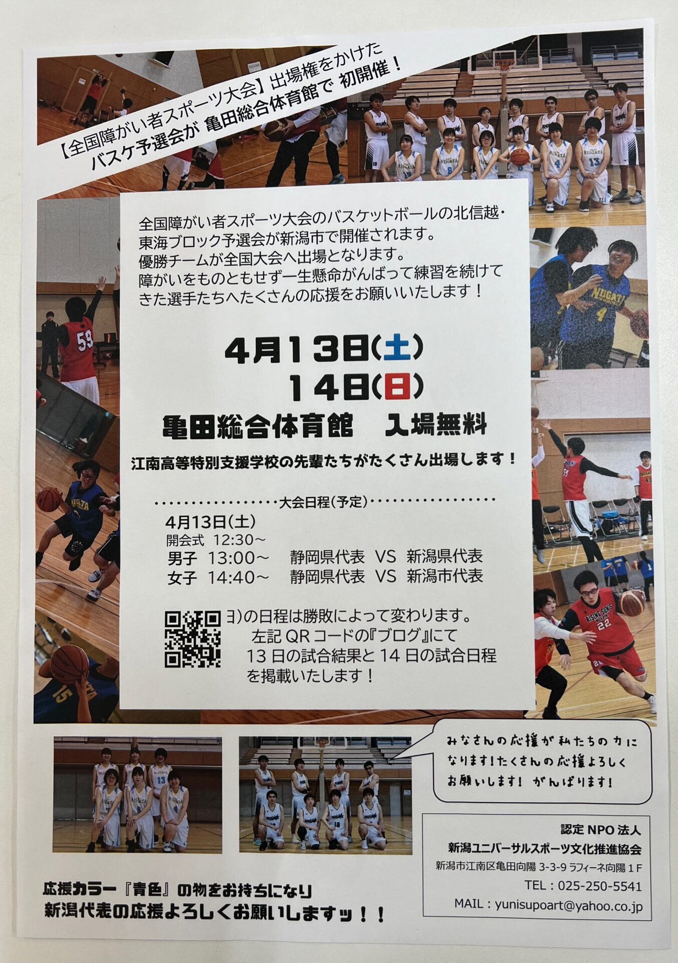 4/13(土)14(日)に亀田総合体育館で全国障がい者スポーツ大会の出場権をかけたバスケットボールの予選会が開催されます。